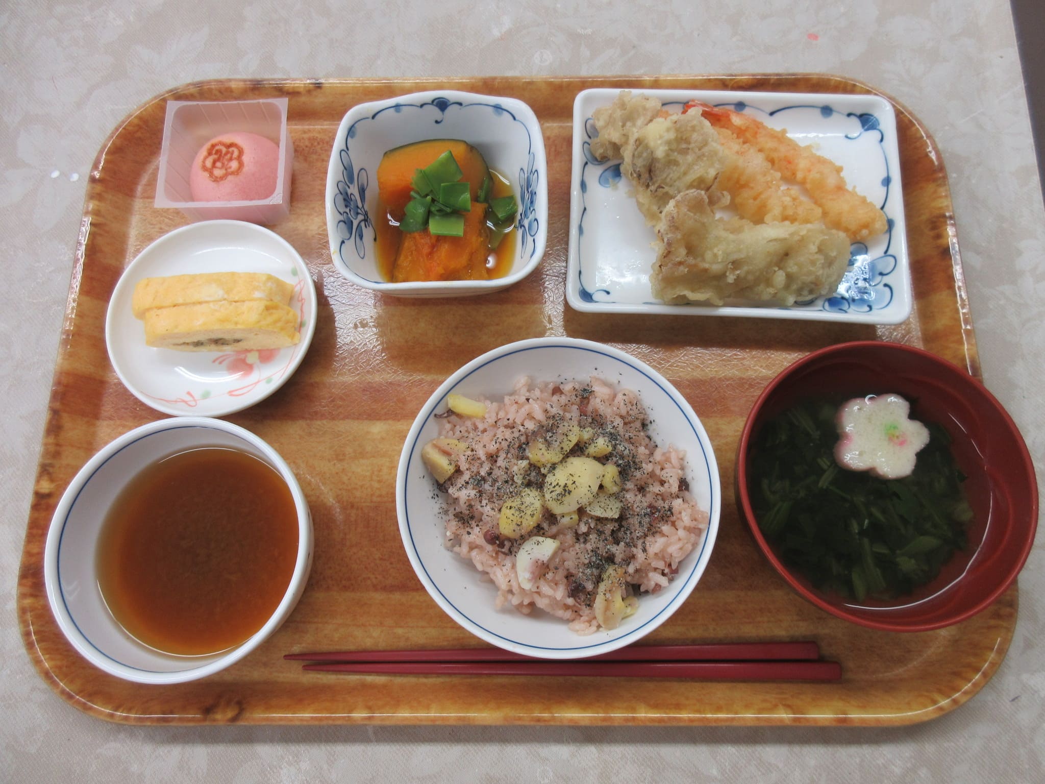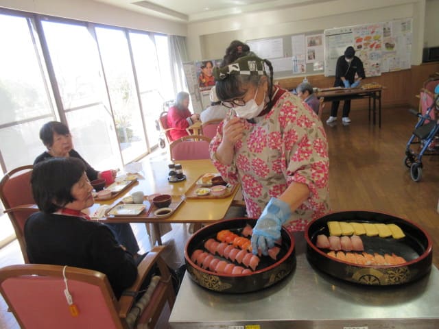 毎日の食事は、健康と楽しみを支える大切な時間です。栄養士が嗜好調査を通して、健康に配慮し、嚙む力や年齢に合わせたやさしい味付けで毎日の食事を楽しんでいただいています。季節感を味あう行事食は格別です。